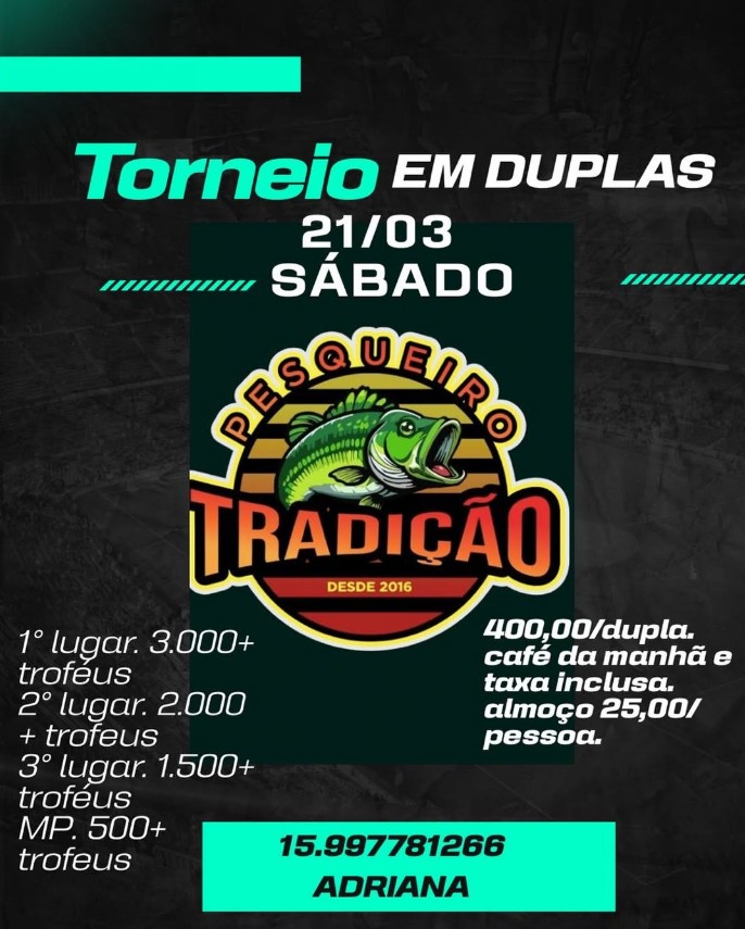 Diego Renan PrestesData: 18/02/2026 Início: 19:30:00 - Término: 23:50:00 horas. Local: Reino EncantadoCidade: Cotia / SPOrg.: Equipe Prestes FishingTipo: Somatoria de Pesos Inscrever-me