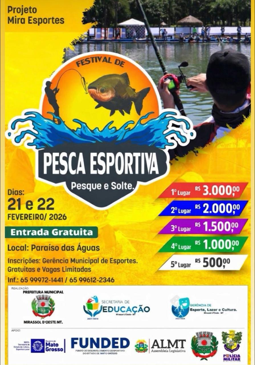 FESTIVAL DE PESCA ESPORTIVA - PESQUE E SOLTE - KIDS 2026Data: 19/02/2026 Início: 08:00:00 - Término: 11:00:00 horas. Local: Paraíso das ÁguasCidade: Mirassol d´Oeste / MTOrg.: Robson JuniorTipo: Somatoria de Pesos Inscrever-me